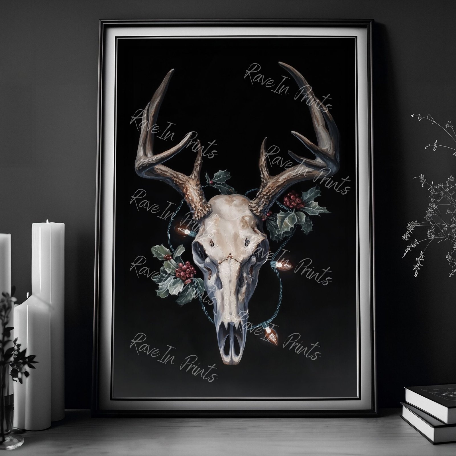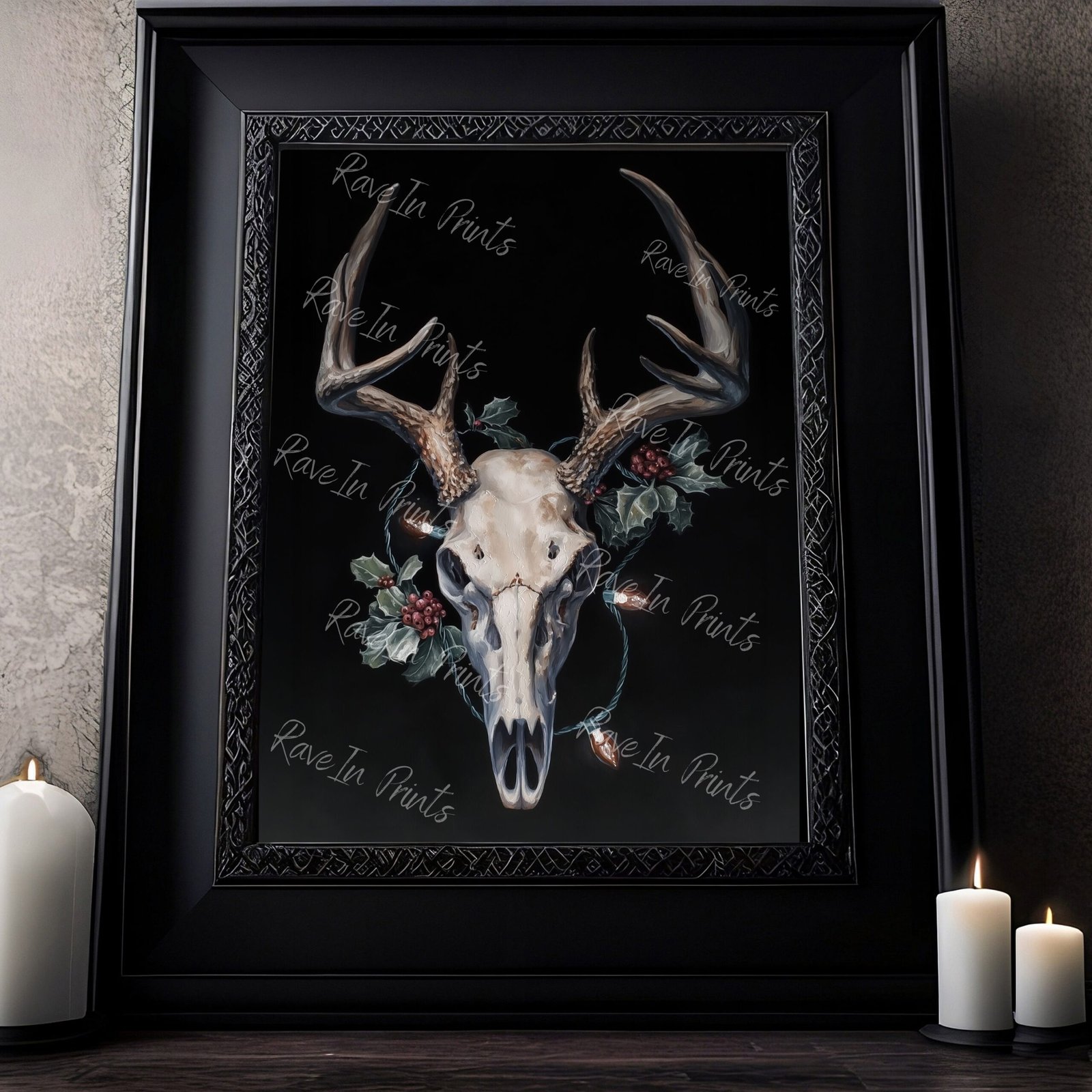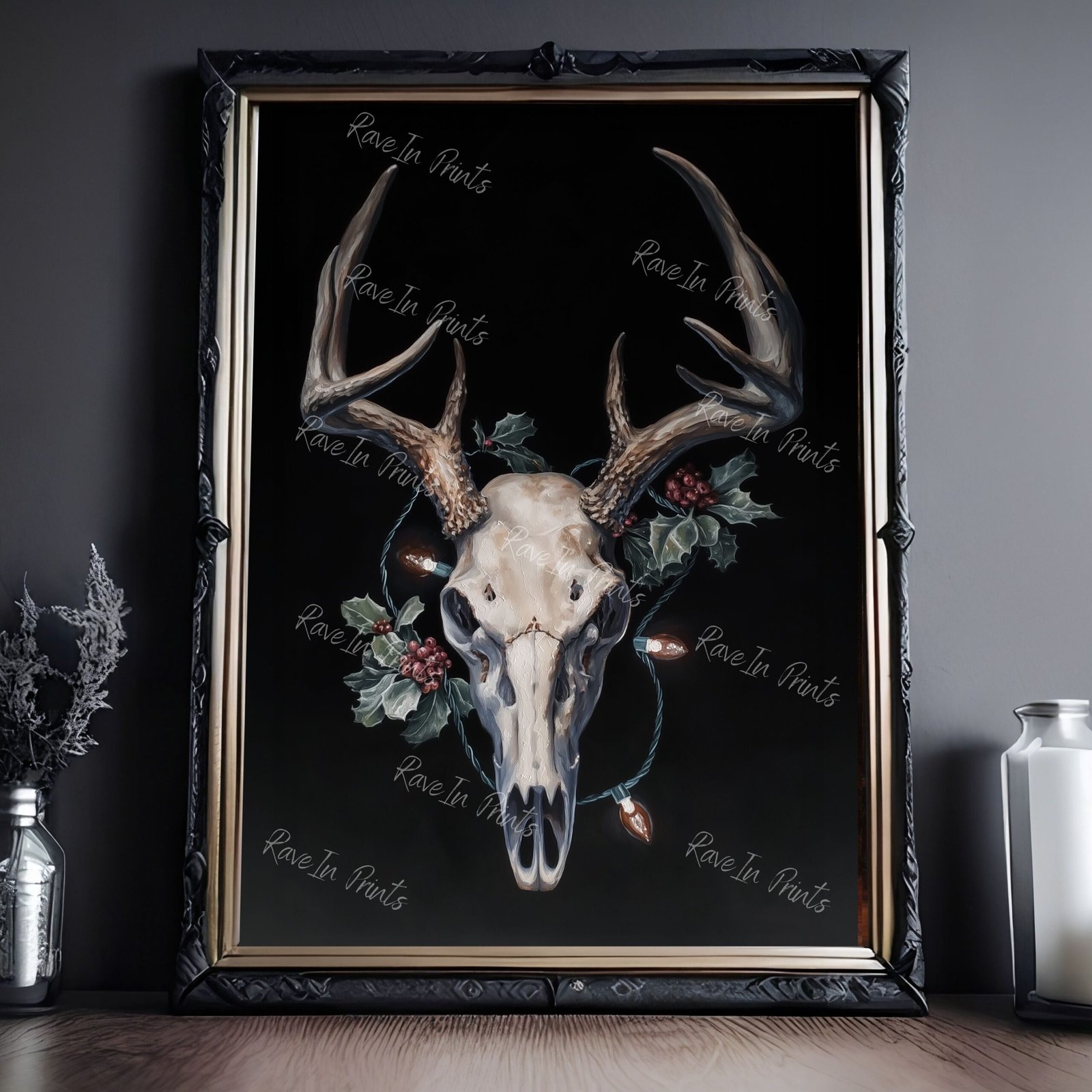 Bring a hauntingly beautiful touch to your holiday decor with this striking deer skull print adorned with holly and glowing Christmas lights. Perfect for lovers of the dark Christmas aesthetic, this piece captures the eerie elegance of winter’s shadows while blending seamlessly with dark academia Christmas decor. The moody tones, gothic charm, and subtle festive details make it an ideal addition to your seasonal gallery wall or as a unique statement piece for those who prefer their holidays with a mysterious edge. This artwork pairs perfectly with candlelight, vintage frames, and cozy dark academia interiors.