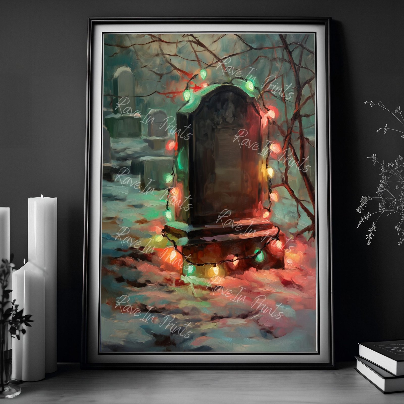 Celebrate the season with a dark twist using this haunting RaveIn Prints artwork. A lone gravestone wrapped in colorful Christmas lights glows against a shadowy winter forest, blending eerie beauty with festive charm. Perfect for Dark Christmas decor, Creepmas displays, or gothic homes that embrace the strange and beautiful side of the holidays.