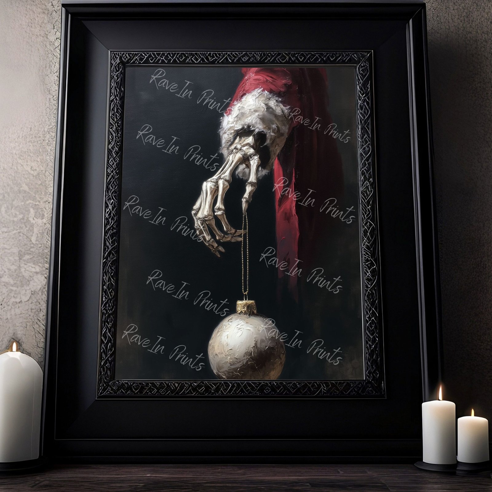 Bring eerie elegance to your holiday decor with this haunting RaveIn Prints piece. A skeletal hand in a Santa sleeve delicately holds a silver ornament, blending festive cheer with gothic style. Perfect for Dark Christmas decor, Creepmas wall art, or anyone who loves spooky holiday vibes with a touch of sophistication.