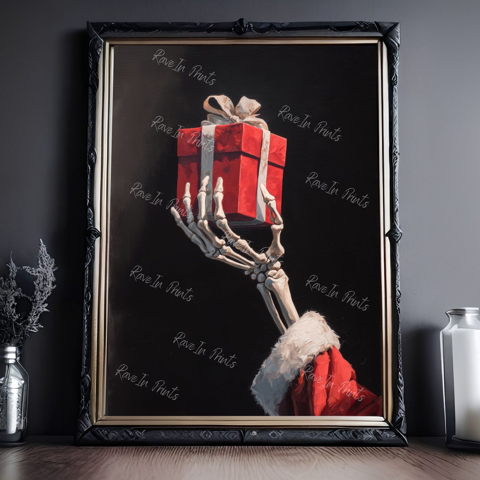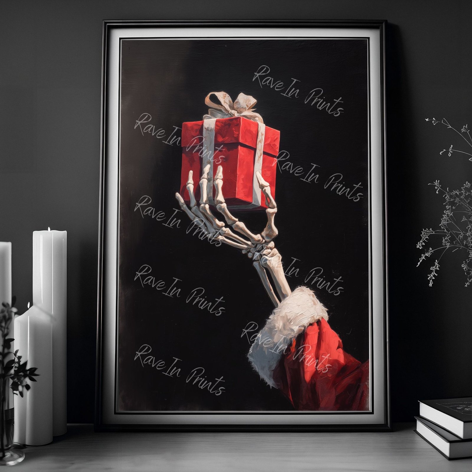 Add a wicked twist to your holiday decor with this striking RaveIn Prints piece. Featuring a skeletal hand in a Santa sleeve holding a bright red gift, this artwork perfectly blends festive cheer with dark gothic style. Ideal for Creepmas decor, Dark Christmas wall art, or anyone who loves a spooky touch to their seasonal space.